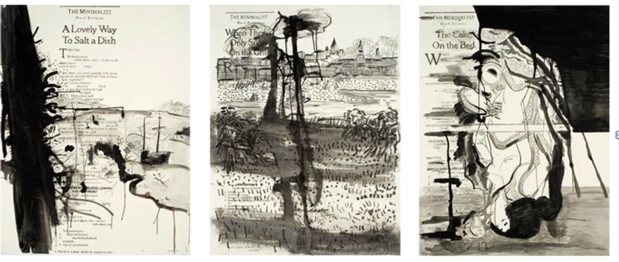 For “And Who Are You?,” Batlle contributed three massive paintings propped up on folding chairs from his ongoing “The Minimalist Series,” which combine fragments of teaser lines and recipes from Mark Bittman’s New York Times culinary column, “The Minimalist.” Like the meals which might seem to be fleeting pleasures but actually have a lasting impact, Batlle’s drawing style appears swift and gestural, but its charm lingers on the artistic palate. In spotlighting the paintings for its online section, New York Magazine‘s Culture Vulture asked whether Batlle might be the “World’s Best Doodler?” And critic Rachel Wolff went on to write “All of us doodle, but not all of us do so in the form of Géricault’s ‘Raft of Medusa’. Not too shabby.”